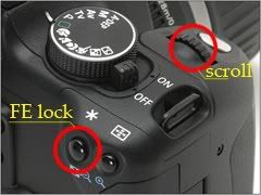 * Tekan tombol Av/FE lock (spt gmb diatas) dan hold (tekan terus) lalu scroll ke kiri sampai bukaan terbesar 3.5 untuk lensa kit 350D, angka 3.5 tampak diatas layar LCD, ini menunjukan nilai aperture atau f.